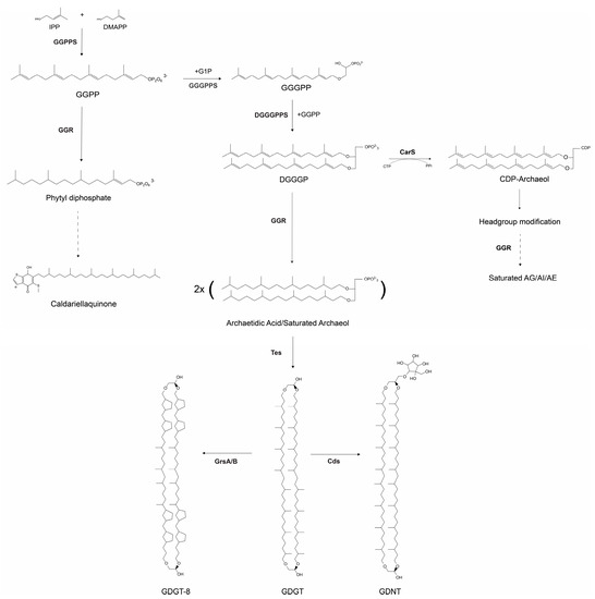 - Jain, S.; Caforio, A.; Driessen, A.J.M. Biosynthesis of archaeal membrane ether lipids. Front. Microbiol. 2014, 5, 641. [Google Scholar] [CrossRef]