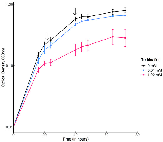 Growth curves of S. acidocaldarius with and without terbinafine: Error bars represent the standard error of the mean. Black arrows indicate the time points for harvesting the cells for lipid extraction.