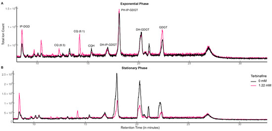 Total ion chromatograms of S. acidocaldarius lipid extracts with and without terbinafine: (A) exponential phase and (B) stationary phase. TIC was normalized to the amount of lipids using the internal standard DOPG.