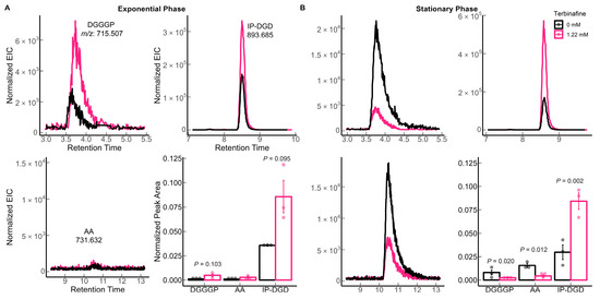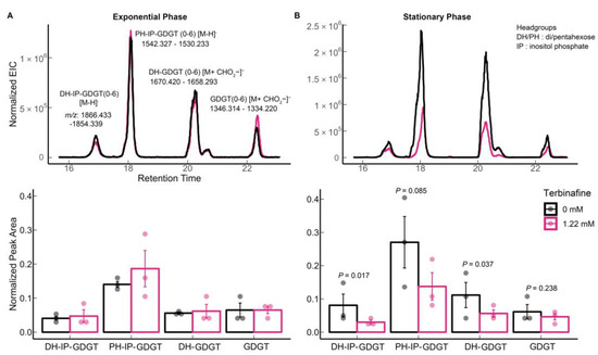 Effect of terbinafine on the bilayer-forming membrane lipids (DGDs) of S. acidocaldarius: Extracted ion chromatograms and relative quantification of DGGGP (digeranylgeranylglyceryl phosphate), AA (archaetidic acid), IP-DGD (inositol phosphate dialkyl glycerol diether) in (A) exponential phase and (B) stationary phase of growth. Error bars represent the standard error of the mean and p-values are indicated for each lipid species. The dots represent biological replicates. The theoretical m/z [M-H]– values are listed in the figure. The extracted ion chromatograms (EICs) were normalized to the amount of lipids using the internal standard DOPG.
