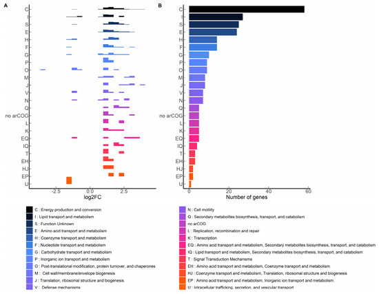 arCOG mapping of significantly affected MW001 genes with terbinafine (p-adjusted < 0.05): (A) Density plot illustrating log2 fold change distribution of genes, (B) Tally of genes mapping to the arCOG categories.