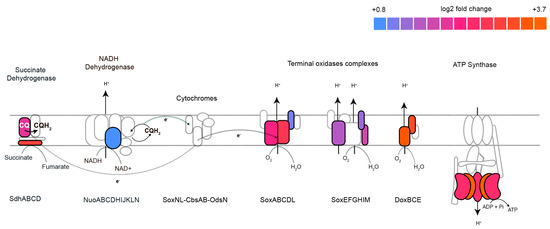 Meanwhile, 260 genes were differentially expressed with 1.22 mM terbinafine. These genes were mapped to the arCOG database. The density plot (Figure 6A) illustrates the categorization of these genes based on arCOGs. Most of the differentially expressed genes (p-adjusted value < 0.05) were mapped to the arCOG pathway ‘Energy production and conversion’, as illustrated by the column graph (Figure 6B). S. acidocaldarius is a strict aerobe which conserves energy by a proton driven chemiosmotic gradient [29]. Transcript levels of sdhA, sdhC, and nuoD were elevated, which are part of the succinate dehydrogenase (SDH) and NADH complexes responsible for reducing quinones [22,30] (Figure 7). This respiratory chain has three terminal oxidase complexes: SoxABCDL, SoxEFGHIM, and DoxBCE [31]. The transcript levels of soxA-C, soxG-I, and doxB-C were also elevated (Figure 7). The ATP synthase complex consists of nine subunits: atpA-I [23]. Transcript levels of atpA and atpB were elevated (Figure 7). This was accompanied by depleted transcript levels of proposed acyl-CoA dehydrogenases, elevated levels of acetoacyl-CoA acetyltransferase and enoyl-CoA hydratase (Supplementary Figure S3).