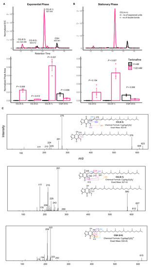 Altered saturation of caldariellaquinone (CQ) under the influence of terbinafine: (A) extracted ion chromatogram (top) and relative quantification of peak areas (bottom) in the exponential phase of growth in S. acidocaldarius and (B) stationary phase. Error bars represent the standard error of the mean, and p-values are indicated for each lipid species. The dots represent biological replicates. (C) Fragmentation patterns of the observed CQ species. The EICs values were normalized to the amount of lipids using the internal standard DOPG.
