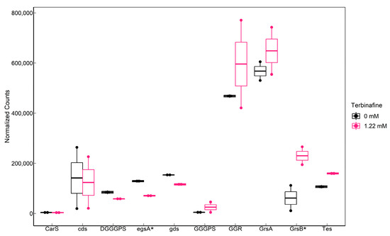 Transcriptomic response of lipid biosynthesis genes in S. acidocaldarius to terbinafine: Significantly affected genes (p-adjusted < 0.05) are indicated by an asterisk (*) on the x-axis. Counts were normalized for sequencing depth using the mean ratio method in DESeq2. cds: saci_1498 (calditol synthase), carS: Saci_0897 (CDP-archaeol synthase), DGGGPS: Saci_1565 (Digeranylgeranylglycerol phosphate synthase), egsA: Saci_0640 (Glycerol-1-phosphate dehydrogenase), gds: Saci_0092 (geranylgeranylpyrophosphate synthase), GGGPS: Saci_0728 (geranylgeranylglycerolphosphate synthase), GGR: Saci_0986 (geranylgeranyl reductase), grsA: Saci_1585 (GDGT cyclization A), grsB: Saci_0240 (GDGT cyclization B), and Tes: Saci_0703 (tetraether synthase).