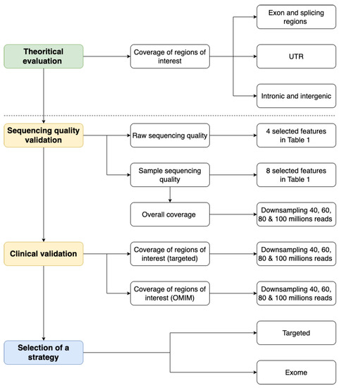 Our diagnostic laboratory previously implemented a GPS strategy for diagnosing myopathies and muscular dystrophies, especially for the giant titin and nebulin genes [3]. To develop an ES strategy with at least the same reliability as GPS, we report here a complete methodology of comparison based on several guidelines previously reported, structured into four main sections: theoretical evaluation of coverage, sequencing quality validation, clinical validation, and final selection of a strategy. We illustrate this method with a comparative study of NGS results obtained on 27 DNA samples using three different exome capture kits.