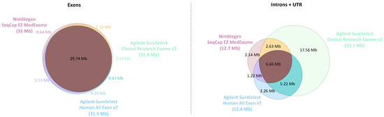 The genome regions targeted by the different ES designs were compared to the genome assembly GRCh37 (hg19) with multiIntersectBed from the bedtools suit [53]. The genomic coordinates of the exon coding sequence (CDS), untranslated regions (UTR), and introns were defined according to the National Center for Biotechnology Information (NCBI) Reference Sequence [54].