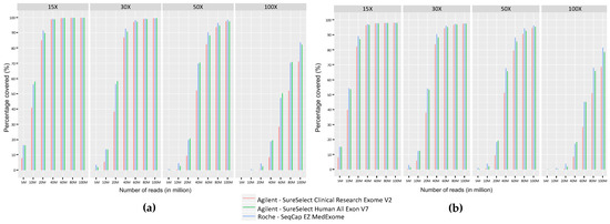 We measured the coverage provided by the three ES kits on regions targeted by our panel of genes implicated in myopathies, routinely used in our laboratory [3] (Figure 4a). 80M reads were necessary to achieve a 30X coverage on more than 99% of the targeted regions and 50M were required to reach a coverage of 30X on more than 95% of the targeted regions. We also evaluated on Integrative Genomic Viewer (IGV) [36,37] the coverage of the repeated regions of TTN (exons 172 to 180, 181 to 189, and 190 to 198) and NEB (exons 82 to 89, 90 to 97, and 98 to 105) that were not adequately covered by older ES kits tested in a previous study [3]. The three ES kits achieved a similar coverage to that obtained with GPS (Supplementary Figure S1).