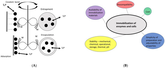 (A) Differences between immobilization techniques based on covalent bonding and adsorption (left) or entrapment and encapsulation (right) from the perspective of applied mechanical forces (M) in the bioreactor represented by a rotating impeller. Mechanical abrasion was applied directly on the adsorbed or covalently bond biocatalyst (left). Entrapment and encapsulation matrices protected biocatalysts from direct mechanical forces (right). The contact of immobilized biocatalysts with substrates (S) and products (P) was direct, using covalent bonding and adsorption as immobilization principles. Entrapment and encapsulation require diffusion of S and P through the immobilization matrix or the semipermeable membrane. (B) The five most important aspects for choosing the immobilization technique for biocatalysts.