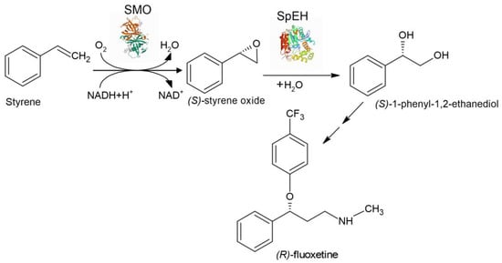 An example of a non-natural enzyme cascade consisting of two steps, including styrene monooxygenase (SMO) in the form of resting E. coli cells and epoxide hydrolase (SpEH) as a cell-free extract for the production of (S)-1-phenyl-1,2,ethanediol [152] as an intermediate for synthesizing the pharmaceutical (R)-fluoxetine [153].