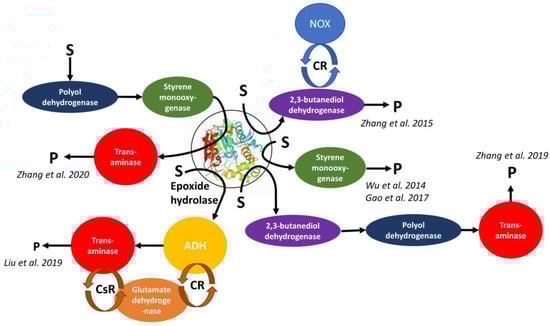 The importance and schematic incorporation of epoxide hydrolase SpEH from Sphingomonas sp. HXN-200 into five independent, non-natural enzyme cascades consisting of two, three, and four enzymes, co-expressed and used in the form of five whole-cell systems, as mentioned in Table 4; S: substrate, P: product, CR: cofactor regeneration, CsR: co-substrate regeneration, NOX: NADH oxidase, and ADH: alcohol dehydrogenase [155,156,158,160,161,162].