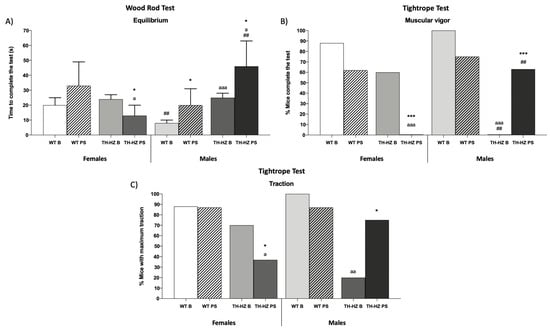Sensorimotor abilities. (A) Time (in seconds) to complete the wood rod test. (B) Percentage (%) of animals that completed the tightrope test. (C) Percentage (%) animals that performed the tightrope test with the maximum traction. Each column represents the mean ± standard deviation of values corresponding to 6 animals. * p < 0.05, *** p < 0.001 compared to basal condition, a p < 0.05, aa p < 0.01, aaa p < 0.001 compared to WT. ## p < 0.01 compared to female. WT B: Wild type basal. WT PS: Wild type post-stress. TH-HZ B: TH-HZ basal. TH-HZ PS: TH-HZ post-stress.