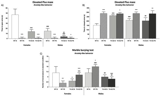 When the anxiety-like behaviors were evaluated, in basal conditions the TH-HZ females presented higher anxiety levels compared with WT B female group. It was shown in the elevated plus maze, where TH-HZ B females spent less time in open arms (Figure 2A p < 0.001) and more time in closed arms (Figure 2B p < 0.001) compared with the WT B group. The male TH-HZ B group also showed higher anxiety levels compared with the WT B group, as they spent a smaller percentage of time in open arms (Table 1 p < 0.01). When the stress effects over anxiety-like behavior were evaluated, WT PS females presented higher anxiety levels, as they spent less time in open arms (Figure 2A p < 0.001) and more time in closed arms (Figure 2B p < 0.001) in the elevated plus maze compared to the female WT B group. In females, the TH-HZ PS group in the elevated plus maze revealed the same result as in the female WT group, thus, stress caused higher anxiety levels (Figure 2A p < 0.001; Figure 2B p < 0.05). However, in TH-HZ PS females, high anxiety levels were also reflected in the marble burying test, where they moved more pieces (Figure 2C p < 0.001) than the TH-HZ B group. On the other side, males after stress also presented higher anxiety levels. WT PS males spent less time in open arms (Figure 2A p < 0.001) and more time in closed arms (Figure 2B p < 0.001) in the elevated plus maze and moved more pieces in the marble burying test (Figure 2C p < 0.05) compared to the WT B group. Similarly, the male TH-HZ PS group showed the same results in the elevated plus maze (Figure 2A p < 0.05; Figure 2B p < 0.01) compared to the TH-HZ B group. When sex differences were analyzed, it could be observed that males showed higher anxiety levels than females. In the elevated plus maze, the male WT B and TH-HZ B groups spent less time in open arms (Figure 2A p < 0.001) and more time in closed arms (Figure 2B p < 0.001; p < 0.01) compared with the female WT B and TH-HZ B groups, respectively. After the stress condition, in the elevated plus maze, either the WT PS or TH-HZ PS males presented higher anxiety levels compared with their corresponding female groups. In contrast, in the marble burying test WT PS males moved more pieces in standard condition (Figure 2C p < 0.001), while TH-HZ PS males moved fewer pieces in standard condition (Figure 2C p < 0.01) in comparison to the females of each group.