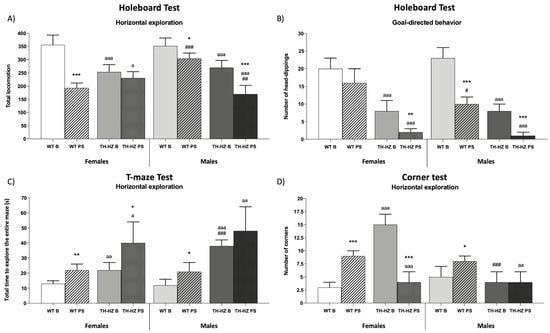 Sex differences in exploratory behaviors were also evident. It was observed that WT B males presented lower locomotion (Table 2 p < 0.05) in HBT compared with WT B females, and this trend was also shown by WT PS males (Table 2 p < 0.001) compared to WT PS females. TH-HZ B males took more time to complete the T-maze (Figure 3C p < 0.001) and visited a fewer number of corners (Figure 3D p < 0.001) in the corner test in comparison to the TH-HZ B females. After stress conditions, TH-HZ males showed lower total locomotion (Figure 3A p < 0.01) in HBT compared with TH-HZ PS female group.