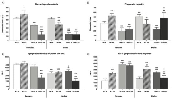 When the immune function parameters were evaluated, several differences were observed. TH-HZ B females and males presented impaired immunity in comparison with both the WT B groups. These impairments are reflected in macrophage functions as the chemotaxis (Figure 4A p < 0.001), phagocytic efficacy (Table 3 p < 0.001), and phagocytic index (Figure 4B p < 0.001), as well as in lymphocyte functions as chemotaxis (Table 3 p < 0.001), basal and LPS proliferative responses (Figure 4D p < 0.001; Table 3 p < 0.001), and in the antitumoral natural killer activity (Table 3 p < 0.001). After stress, WT females improved their macrophage chemotaxis (Figure 4A p < 0.05), phagocytic efficacy (Table 3 p < 0.01), phagocytic index (Figure 4B p < 0.001), and their natural killer activity (Table 3 p < 0.001), whereas lymphocyte chemotaxis (Table 3 p < 0.001) and basal lymphoproliferation (Figure 4D p < 0.001) were impaired compared to the WT B group. TH-HZ females did not show any improvement after stress; thus they presented an impaired macrophage and lymphocyte chemotaxis (Figure 4A p < 0.001; Table 3 p < 0.001), and lymphoproliferation in response to ConA and LPS (Figure 4C p < 0.001; Table 3 p < 0.001) in comparison to the TH-HZ B group. Similarly, males after stress showed a general impairment of their immune function. WT PS males showed an altered macrophage function in their chemotaxis (Figure 4A p < 0.001), phagocytic efficacy (Table 3 p < 0.05), and phagocytic index (Figure 4B p < 0.01), and a higher basal lymphoproliferation (Figure 4D p < 0.001) compared to the WT B group. On their side, TH-HZ PS males showed greater impairment in their phagocytic efficacy (Table 3 p < 0.01), phagocytic index (Figure 4B p < 0.01), lymphocyte chemotaxis (Table 3 p < 0.05), a higher basal lymphoproliferation (Figure 4D p < 0.01), a lower lymphoproliferation in response to ConA and LPS (Figure 4C p < 0.001; Table 3 p < 0.001), and a deteriorated natural killer activity (Table 3 p < 0.01) with respect to the TH-HZ B group. In general, males of all groups presented an impaired immune function compared to females of the same group (Table 3 and Figure 4).