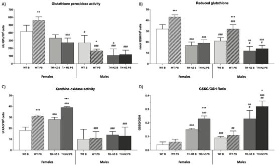 When the oxidative stress parameters were evaluated, TH-HZ B females exhibited a greater rate of oxidative stress in comparison to the WT B group. They showed lower catalase (CAT) and glutathione reductase (GR) activities (Table 3 p < 0.001; p < 0.05), lower levels of reduced glutathione (GSH) (Figure 5B p < 0.001), higher xanthine oxidase (XO) activity (Figure 5C p < 0.001), higher levels of oxidized glutathione (GSSG) (Table 3 p < 0.05), and a higher GSSG/GSH ratio (Figure 5D p < 0.001) with respect to the female WT B group. TH-HZ B males presented lower amounts of antioxidant defenses, such as GR (Table 3 p < 0.01) and glutathione peroxidase (GPx) activities (Figure 5A p < 0.05), as well as lower amounts of GSH (Figure 5B p < 0.01) and higher levels of oxidant compounds such as GSSG (Table 3 p < 0.001), which were translated in a higher GSSG/GSH ratio (Figure 5D p < 0.01) in comparison to the WT B group. After stress, WT females showed greater antioxidant defenses, GR, and GPx activities (Table 3 p < 0.001; Figure 5A p < 0.01), and higher levels of GSH (Figure 5B p < 0.001), but they also exhibited greater amounts of oxidant compounds as evidenced by the XO activity and GSSG (Figure 5C p < 0.001; Table 3 p < 0.001) compared to the WT B group. Female TH-HZ PS mice presented greater amounts of GR and XO activity, and GSSG (Table 3 p < 0.05; Figure 5C p < 0.001; Table 3 p < 0.001;), as well as a higher GSSG/GSH ratio (Figure 5D p < 0.001) with respect to the TH-HZ B group. Males after stress showed a similar response to females. WT PS males exhibited higher levels of CAT, GR activities, and GSH (Table 3 p < 0.01; p < 0.05; Figure 5B p < 0.001), lower GPx activity (Figure 5A p < 0.05), and higher amounts of GSSG (Table 3 p < 0.001) compared to the WT B group. TH-HZ PS males showed a greater GR activity (Table 3 p < 0.001), as well as greater levels of GSSG (Table 3 p < 0.001) and a higher GSSG/GSH ratio (Figure 5D p < 0.05) with respect to the TH-HZ B group. Finally, when females and males were compared, it was observed that males presented a higher oxidative profile than females, having lower levels of antioxidant compounds and greater amounts of oxidant compounds in comparison to females, and this was reproduced in all experimental groups (Table 3 and Figure 5).