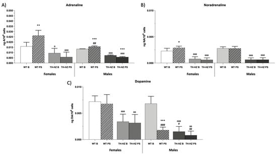 Finally, the catecholamine concentrations were evaluated. TH-HZ B females and males showed lower concentrations of adrenaline (A) (Figure 6A p < 0.05; p < 0.001), noradrenaline (NA) (Figure 6B p < 0.001; p < 0.001), and dopamine (DA) (Figure 6C p < 0.001; p < 0.001) in their peritoneal leukocytes compared to the WT B group. After stress, female WT PS mice increased their A and NA concentrations (Figure 6A p < 0.01; Figure 6B p < 0.05) with respect to the female WT B group, whereas the male WT PS group increased their A amounts (Figure 6A p < 0.001) and decreased their DA concentrations (Figure 6C p < 0.001) in comparison to the male WT B group. Regarding the TH-HZ groups, no differences were observed after stress, except for a decrease in the A concentrations in the male TH-HZ PS group (Figure 6A p < 0.001). Finally, in basal conditions, there was not any difference due to sex in the WT group, but after stress WT PS males showed a lower concentration of A and DA (Figure 6A p < 0.01; Figure 6C p < 0.001) with respect to the female WT PS group. In the TH-HZ group, the catecholamine concentrations were similar in females and males. Only TH-HZ males showed a lower concentration of DA in the basal and post-stress conditions (Figure 6A p < 0.05; Figure 6A p < 0.01) with respect to the female TH-HZ groups.