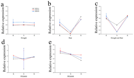 An Ensembl Plants database search showed that TaGB1 exists in three chromosomal groups of A, B and D. Therefore, we named the three homologs TaGB1-A, -B and -D. The homologies of the three homologs in the coding sequence are 99.33%, and the homologies of the amino acid sequence are 99.91%. In order to further analyze the difference of expression of these three homologs under stress treatment, we also downloaded the relative expression abundance of TaGB1 homologues in the leaves of 7-day-old seedlings under drought-, heat- and PEG-simulated drought stress from the wheat expression database (Table S1). Then, we analyzed the expression levels of TaGB1 genes under different stress conditions. From the overall trend, the expression level of all three homologs is similar (Figure 1), but due to the large difference in the expression levels of TaGB1-B under different stress treatments, we finally decided to select TaGB1-B for follow-up research.