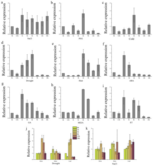 The expression of TaGB1-B under different stress treatments and tissue-specific expression of TaGB1-B under drought and salt treatments in one-week-old wheat seedling. (a) The expression of TaGB1-B under NaCl treatment; (b) PEG6000; (c) cold; (d) drought; (e) heat; (f) ABA; (g) GA; (h) MeJA; and (i) ET. (j) Tissue-specific expression of TaGB1-B under drought treatment. (k) Tissue-specific expression of TaGB1-B under salt treatment. Error bars show standard deviations (mean ± SD and n = 3).