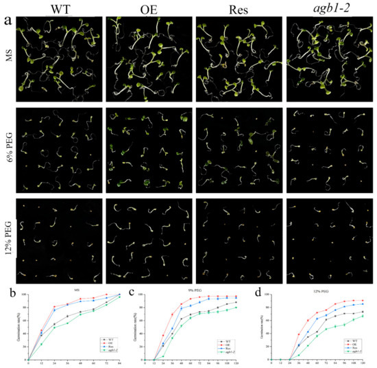 Germination assay of wild-type (WT), TaGB1-B overexpression Arabidopsis, mutant Arabidopsis (agb1-2) and complementary mutant (Res) seeds under PEG6000 treatment. (a) The phenotypes of WT, TaGB1-B overexpression Arabidopsis, mutant Arabidopsis (agb1-2) and complementary mutant seeds under 9% and 12% PEG6000 treatments. (b) The germination rates of WT, TaGB1-B overexpression Arabidopsis, mutant Arabidopsis (agb1-2) and complementary mutant seeds at different time points on the MS medium. (c) The germination rates under 9% PEG6000 treatment. (d) The germination rates under 12% PEG6000 treatment.