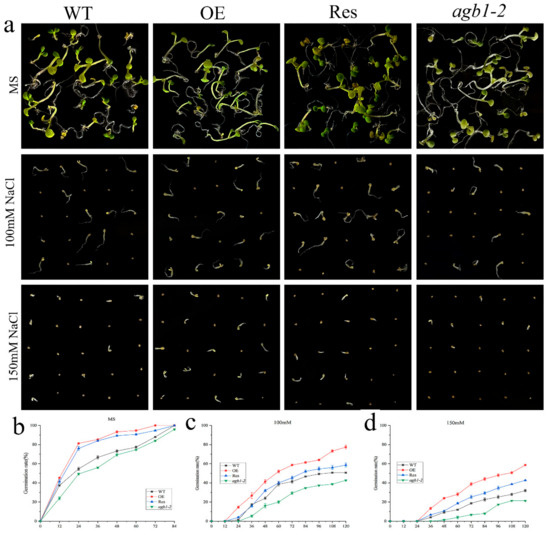 Germination assay of wild-type (WT), TaGB1-B overexpression Arabidopsis, Arabidopsis mutants (agb1-2) and complementary mutant (Res) seeds under NaCl treatment. (a) The phenotypes of WT, TaGB1-B overexpression of Arabidopsis, mutant Arabidopsis (agb1-2) and complementary mutant seeds under 100 mM and 150 mM NaCl treatments. (b) The germination rates of WT, TaGB1-B overexpression of Arabidopsis, mutant Arabidopsis (agb1-2) and complementary mutant seeds at different time points on the MS medium. (c) The germination rates under 100 mM NaCl treatment. (d) The germination rates under 150 mM NaCl treatment.