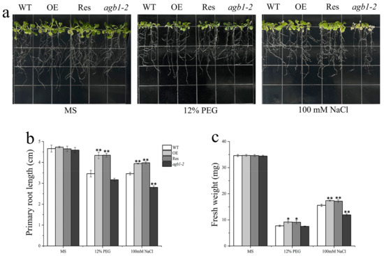 After that, we conducted root length experiments and evaluated the phenotypic changes of these lines. For samples cultured on the MS medium, the root length of Arabidopsis lines did not change significantly (Figure 5). However, the growth of each line was significantly limited in the MS medium supplemented with PEG6000 or NaCl, and fresh weight also decreased, and the root length and fresh weight of OE and Res lines were significantly higher than those of WT and agb1-2. Therefore, the TaGB1-B gene may affect the ability of Arabidopsis to resist drought and salt stress.