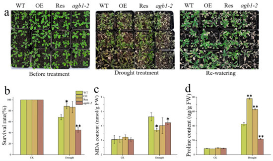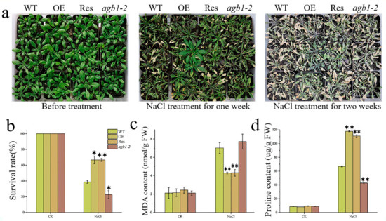 To explore whether TaGB1-B is involved in plant stress resistance at the seedling stage, we conducted drought and salt treatments in the Arabidopsis seedling stage. We counted the survival rate of the four lines and measured the corresponding proline (Pro) and malondialdehyde (MDA) contents. We found that there was no difference among the lines before treatment (Figure 6a and Figure 7a). After treatment, all Arabidopsis lines were stressed. After two weeks of drought stress, agb1-2 withered seriously. However, the effect of drought stress on OE and Res is relatively little effect. After 3 days of re-watering, OE and Res continued to grow, while agb1-2 died as the leaves turned green. The survival rates of OE and Res were 88% and 86%, much higher than WT (68%) and agb1-2 (45%) (Figure 6b). The MDA content of OE was significantly lower than WT, while the Pro content was higher than WT (Figure 6c,d). These results showed that overexpression of TaGB1-B enhanced the drought tolerance of Arabidopsis. After salt stress, WT and agb1-2 were undergoing serious chlorosis, while OE and Res were slightly withered. The survival rate of OE (66%) and Res (66%) was higher than that of WT (38%) and agb1-2 (22%) (Figure 7b). After stress, the content of Pro in OE and Res was significantly higher than WT and agb1-2, and the content of MDA was significantly lower than WT and agb1-2 (Figure 7c,d). The above results showed that the overexpression of TaGB1-B enhanced the salt tolerance of Arabidopsis.