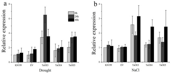 In order to determine the role of TaGB1-B in drought and salt tolerance of wheat, transgenic lines of wheat variety KeNong 199 (KN199) overexpressing TaGB1-B and an empty vector gene were produced, and T3 transgenic homozygous lines were obtained and detected by qRT-PCR. We selected three T3 generation TaGB1-B overexpression wheat transgenic lines (TaOE3, TaOE4, TaOE5) with high expression levels, and one T3 generation transgenic wheat line with an empty vector (EV) for follow-up experiments (Figure S2). We evaluated the expression level of TaGB1-B under drought and salt stress in one-week-old overexpression wheat seedlings. The data indicated that under stress conditions, the expression levels of TaGB1-B genes were upregulated in WT and transgenic plants, but the expression levels were higher in the TaGB1-B overexpressing plants than in the control plants (Figure 8). Under drought stress, the expression of TaGB1-B reached its peak at 24 h, and then showed a downward trend. The expression of TaGB1-B in TaOE3 was the highest at 24 h, being about 6.5 times higher (Figure 8a). Under salt stress, the expression of TaGB1-B decreased first and then increased. The expression of TaGB1-B in TaOE3 was the highest at 48 h, being about 3.4 times higher (Figure 8b).