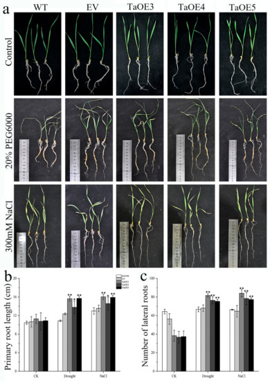 TaGB1-B enhanced the drought and salt tolerance of wheat. (a) Drought and salt stress tolerance responses of TaGB1-B overexpression transgenic KN199 and the empty vector transgenic plants. (b) Primary root length. (c) Number of lateral roots. Data are presented as the mean ± standard deviation calculated from triplicates. * and ** above each column indicate a significant difference compared with WT plants (* p < 0.05; ** p < 0.01).