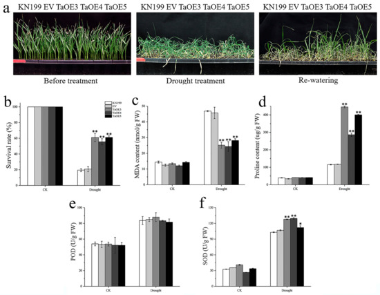 The functional characteristics of TaGB1-B overexpression wheat plants under drought stress. (a) Phenotypic analysis of TaGB1-B overexpression plants under normal treatment, drought stress treatment for 14 days and rehydration for 3 days. (b) The survival rate of each line after drought stress. (c–f). Physiological index of wheat plant. (c) MDA content. (d) Proline content. (e) POD. (f) SOD. The error column represents the standard deviation (mean ± SD and n = 3), and * and ** above each column indicate a significant difference compared with WT plants (* p < 0.05; ** p < 0.01).