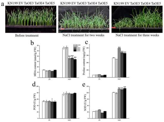 The functional characteristics of TaGB1-B overexpression wheat plants under NaCl stress. (a) Phenotypic analysis of TaGB1-B overexpression plants under normal treatment, NaCl stress treatment for two weeks and NaCl stress treatment for three weeks. (b–e) Physiological index of wheat plant. (b) MDA content. (c) Proline content. (d) POD. (e) SOD. The error column represents the standard deviation (mean ± SD and n = 3), and and ** above each column indicate a significant difference compared with WT plants (** p < 0.01).