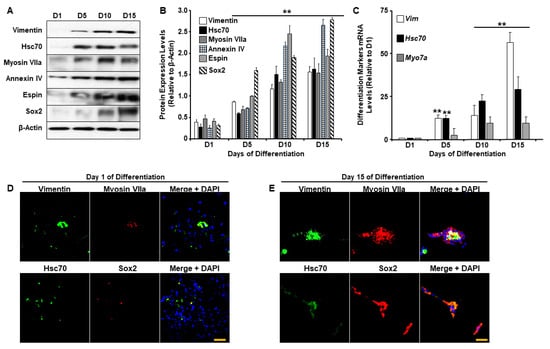 UB/OC-2 cells differentiate into sensory hair cells. (A,B) Representative immunoblots (A) and bar graph quantitative assessment (B) of Vimentin, Hsc70, Myosin VIIa, Espin, Annexin IV, and Sox2 in total cell lysates from UB/OC-2 during differentiation. Data is representative of at least three independent experiments. (C) mRNA levels of differentiation markers Vim, Hsc70, and Myo7a. Data are normalized to Tbp and are representative of at least three independent experiments. In (B,C), ** p < 0.01 indicates a significant difference between cells on the indicated day of differentiation (D5, D10, or D15) and undifferentiated cells (D1). (D,E) Immunofluorescence of Vimentin, Hsc70 (green fluorescence), Sox2, Myosin VIIa (red fluorescence), and nuclear DNA using DAPI (blue fluorescence) in undifferentiated (Day 1; (D)) and differentiated (Day 15; (E)) UB/OC-2 cells. Scale bar = 100 μm.