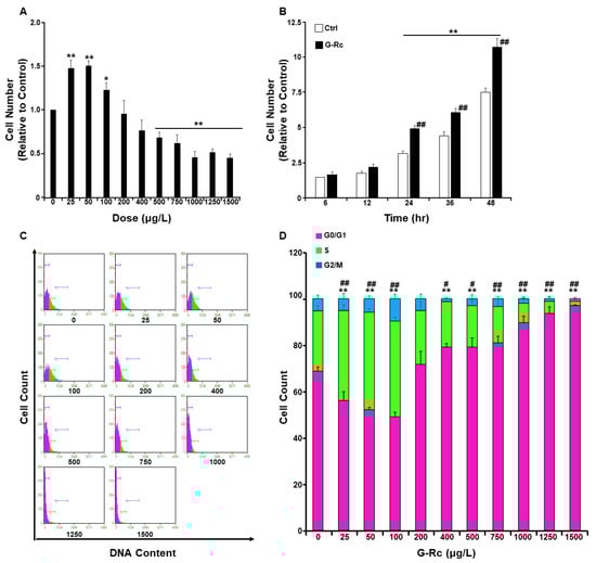 Effects of G-Rc on cell survival/toxicity, proliferation, and cell cycle. (A) Effects of G-Rc on cell survival using the MTT method. Undifferentiated UB/OC-2 cells were treated with increasing doses of G-Rc for 24 h. Bar graphs represent the intensity of formazan (produced from MTT by viable cells) staining reflective of the cell number and presented as means + SEM. (B) Effects of G-Rc on cell proliferation using the SRB method: cells were treated with G-Rc (25 μg/L) for up to 48 h. Bar graphs represent the intensity of SRB staining reflective of the cell number and presented as means + SEM. (C) Cell cycle analysis and assessment of DNA content in undifferentiated UB/OC-2 cells treated with the indicated concentration (0–1500 μg/L) of G-Rc for 24 h. A representative histogram for each treatment is shown. (D) Bar graphs represent the percentages of cells in each phase of the cell cycle, which were estimated using the GuavaSuite Software package, and are presented as means + SEM from three independent experiments. In (A), * p < 0.05 and ** p < 0.01 indicate a significant difference between the indicated concentration of G-Rc and control cells non-treated with G-Rc. In (B), ** p < 0.01 indicates a significant difference between the indicated time and control cells at 6 h post-seeding. ## p < 0.01 indicates a significant difference between G-Rc-treated cells and control cells non-treated with G-Rc. In (D), ** p < 0.01 indicates a significant difference in DNA content between G-Rc-treated cells and control cells non-treated with G-Rc while at the G0/G1 phase. # p < 0.05 and ## p < 0.01 indicate a significant difference in DNA content between G-Rc-treated cells and control cells non-treated with G-Rc while at S phases.