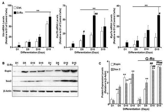 It is well-established that sensory hair cells in the mammalian inner ear are exceptionally sensitive to various genetic and environmental stressors and lack spontaneous regenerative capacity. As such, injuries leading to cochlear hair cell death often result in permanent hearing loss [23,24]. Experimental attempts that aim to prevent and treat insults to hair cells have been hampered by the limited ability to use hair cells in a laboratory setting and are further impeded by a lack of understanding of how these cells behave and function in vitro. Recent studies have demonstrated that UB/OC-2 primary murine cells could differentiate into cochlear hair cells. This process of differentiation is accompanied by the expression of several specific markers including Myosin VIIa, Parvalbumin 3, Purkinje cell protein 4 (PCP4), Annexin IV, Espin, and SRY-box 2 (Sox2) [25,26], among others. Therefore, before investigating the effects of G-Rc on hair cell homeostasis, we first confirmed the differentiation potential of UB/OC-2 cells by examining changes in the expression of Vimentin, Heat shock cognate 70 (Hsc70), Myosin VIIa, Annexin IV, Espin, and Sox2 upon differentiation. As shown in Figure 1A,B, immunoblotting revealed an increase in the expression of all proteins upon incubation of the cells for 15 days at 38 °C. The levels of these proteins were significantly higher after 5, 10, and 15 days of differentiation (Figure 1B). Consistent with these findings, Vim, Hsc70, and Myo7a mRNA levels (Figure 1C) were also significantly higher on days 10 and 15 of differentiation. To further validate our experimental model, we assessed the expression of Vimentin, Myosin VIIa, Hsc70, and Sox2 by immunofluorescence. As demonstrated in Figure 1D,E, on day 15 of differentiation (Figure 1E), UB/OC-2 cells expressed higher levels of Vimentin, Myosin VIIa, Hsc70, and Sox2 compared to undifferentiated cells (Figure 1D). Together these data confirm and validate previous studies on the ability of UB/OC-2 cells to differentiate into functional cochlear hair cells [27,28].
