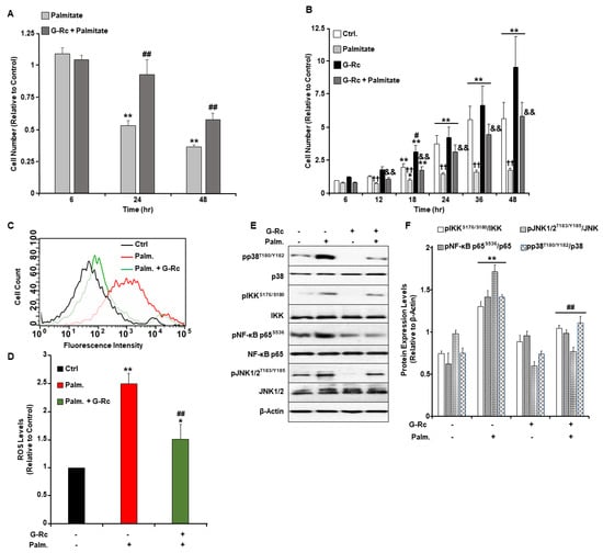 2.4. A Physiologically Relevant Dose of G-Rc Alleviates Palmitate-Induced Alterations to Cell Survival and Proliferation, Oxidative Stress, and Inflammation