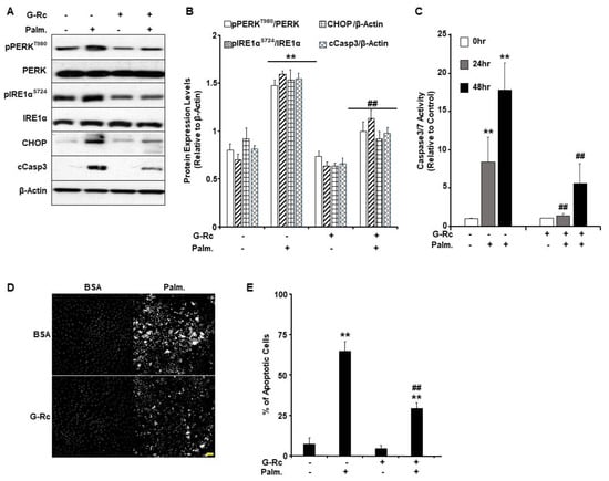 2.5. G-Rc Alleviates Palmitate-Induced ER Stress and Apoptotic Cell Death