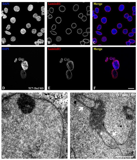 Figure 1. Alterations in the nuclear envelope in TC7 Cbx3 KO cells. (AF) Immunofluorescence of the nuclear envelope-associated protein LaminB1: large alterations can be seen in cells lacking HP1γ (DF), whereas no abnormalities are seen in WT cells (AC); (G,H) TEM analysis of nuclear envelope alterations in TC7 WT (G) or Cbx3 KO (H) cells: double membrane inclusions can be observed in cells lacking HP1γ (H, arrows). n = 5 clones analyzed per condition, 2 plates per clone. Scale bar: (AF) 20 µm; (G,H) 1 µm.