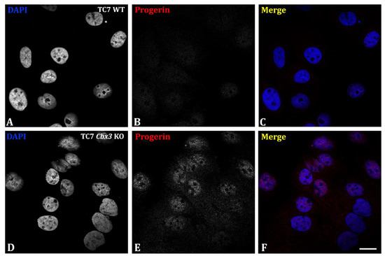 As shown in our previous work [15], the deletion of HP1γ leads to the production of progerin linked to an alteration in splicing fidelity (Figure 2). Progerin production was consistent with the laminopathy phenotype previously described (Figure 1). We compared progerin detection levels in TC7 WT cells (Figure 2A–C) and TC7 Cbx3 KO cells (Figure 2D–F). In TC7 Cbx3 KO cells, we detected progerin labeling in the nucleus (Figure 2D–F), whereas levels of this protein remained undetectable in WT cells (Figure 2A–C).