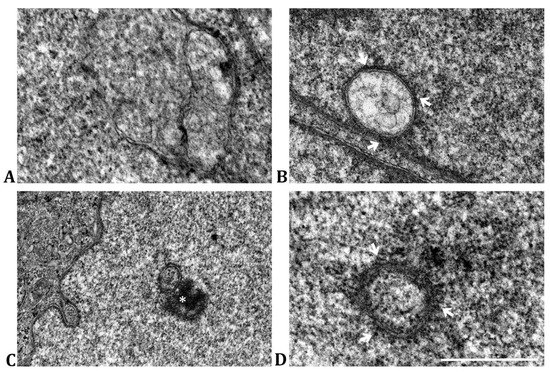 The structure and localization of these anomalies suggested that they were fragments of the nuclear envelope of the cell. This was supported by not only their double membrane conformation, but also their strong association with ribosomes (Figure 3B,D, arrows), as in the case of the nuclear envelope [21].
