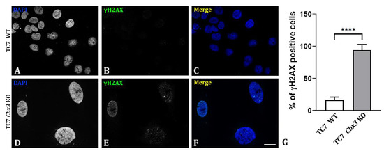 Recurrent cytoplasmic DNA accumulations were detected in TC7 Cbx3 KO cells, as shown by DAPI staining (Figure 4A). To further investigate these initial observations, we conducted a comprehensive electron microscopic analysis to search for chromatin inclusions in the cytoplasm of TC7 Cbx3 KO cells. (Figure 4B–D). Indeed, our analysis revealed structures composed of a double membrane, similar in nature to the nuclear envelope, within chromatin inside (Figure 4B,C). These inclusions were frequently observed independently of the nuclear envelope and could be located at some distance from it. In addition, we observed electrodense structures in the cytoplasm that were similar in nature to free chromatin (Figure 4D, asterisk). These findings led us to believe that they could be fragments of nuclear chromatin that had become detached due to the genomic instability previously reported upon Drosophila HP1 loss [20]. We thus searched for the activation of the DNA damage response by performing immunolabeling of γH2AX followed by fluorescence microscopy analysis.