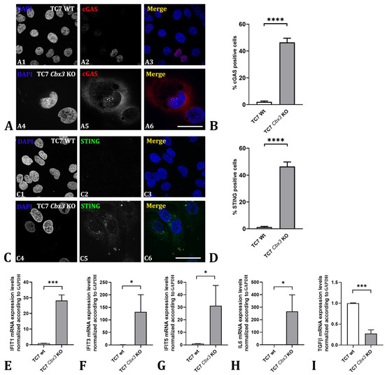 We therefore investigated the potential relationship between the loss of HP1γ and the activation of the cGAS/STING pathway. For this purpose, we carried out a study by immunofluorescence microscopy in which we compared the detection of cGAS and STING proteins in TC7 WT vs. TC7 Cbx3 KO cells (Figure 6A,B).