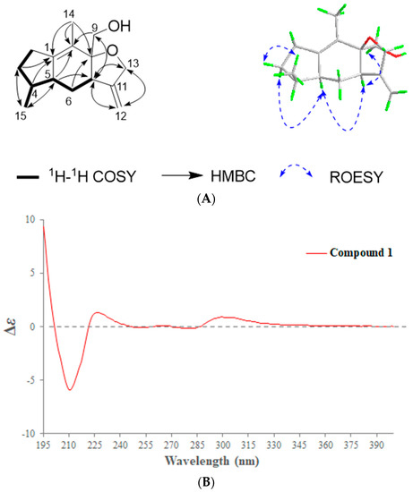 Compound 1 was isolated as a colorless oil. Its molecular formula was identified as C15H22O2 (five degrees of unsaturation) by its positive-ion HRESIMS (257.1514 [M + Na]+, calcd. 257.1512, Figure S1). The 1H-NMR spectrum (Figure S2) displayed characteristic signals for one methyl singlet at δH 1.58 (3H, s), one methyl doublet at δH 0.62 (3H, d, J = 7.2 Hz), two oxymethylene groups at δH 3.29 (1H, d, J = 10.8 Hz, H-9α), 3.43 (1H, d, J = 10.8 Hz, H-9β), 4.21 (1H, d, J = 13.2 Hz, H-13α), and 4.31 (1H, d, J = 13.2 Hz, H-13β), and one terminal double bond at δH 4.84 (1H, s, H-12a) and 4.96 (1H, s, H-12b). The 13C-NMR and HSQC spectra (Figures S3 and S4) showed that compound 1 had 15 carbon signals, including two groups of double bond signals (δC 153.7, 144.5, 123.7, 104.0), two methyl signals (δC 13.5, 12.3), two sp3 oxymethylene signals (δC 68.9, 63.5), three sp3 methylene signals (δC 31.9, 30.0, 26.6), three sp3 methine signals (δC 45.8, 44.2, 36.0), and one sp3 quaternary carbon signal (δC 86.2). The unsaturation of compound 1 minus the two unsaturations occupied by two groups of double bonds leaves three unsaturations, indicating that compound 1 should be a sesquiterpene with a three-ring system. Further analysis of 1H-1H COSY and HMBC spectra (Figures S5 and S6) can confirm that compound 1 is a guaiane type sesquiterpene (Figure 1A), and the NMR signal of compound 1 is very similar to that of the known compound daphne A [11]. After detailed comparison with daphne A, it is found that compound 1 had one more methylene signal (δC 26.6) and lacked one oxygenated methine signal (δC 71.1) compared with daphne A. It indicated that compound 1 should be the product of the reduction of 2-hydroxy group in daphne A. This conclusion was further confirmed by 1H-1H COSY and HMBC data, and this structure was consistent with the molecular weight of compound 1. Thus, the planar structure of compound 1 was identified as shown in the figure.
