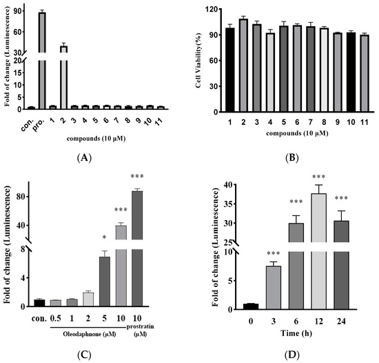 As shown in Figure 2A, all compounds except compound 2 (oleodaphnone) did not show the effect of activating latent HIV at 10 μM. After compound 2 treatment of NH2 cells, the fold change in luciferase activity was 40.25, and the fold changes of luciferase activity for the positive control prostraitin was 88.05. In addition, treatment of NH2 cells with all compounds (10 μM) for 24 h had no effect on cell survival (Figure 2B), and treatment of NH2 cells with different concentrations of compound 2 for 48 h also had no effect on cell survival. To comprehensively assess the HIV latency-reversing activity of oleodaphnone, the NH2 cells line was treated with different concentrations of oleodaphnone, (0.5, 1, 2, 5, and 10 μM) and prostratin (10 μM) for 24 h. Following treatment, the HIV latency-reversing activity was measured, indicating that oleodaphnone reactivated latent HIV in a dose-dependent manner (Figure 2C). Next, we measured the time-dependent reactivation of latent HIV. NH2 cell lines were treated with 10 μM oleodaphnone for 3, 6, 12, and 24 h and assessed for HIV latency-reversing activity. This showed that oleodaphnone reactivated latent HIV in a time-dependent manner (Figure 2D). The maximal HIV latency-reversing activity of oleodaphnone might be achieved with a processing time of approximately 12 h (Figure 2C). Altogether, these data confirmed that oleodaphnone activates latent HIV in a dose- and time-dependent manner, supporting the conclusion that oleodaphnone is an efficient HIV LRA.