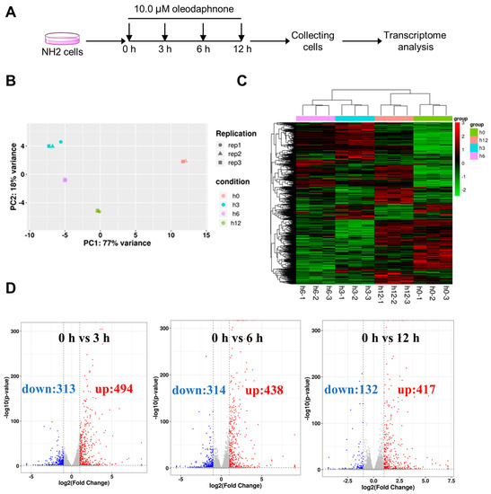 Time course evaluation of the gene transcription profiles of oleodaphnone-treated NH2 cells. (A) Diagram of the protocol used to generate samples for transcriptome-wide sequencing. NH2 cell cultures were treated with 10 μM oleodaphnone at the indicated time points and collected at the last time point. (B) PCA of 12 independent samples treated under the indicated conditions. The transcript levels of each independent sample were subjected to principal component analysis (PCA) regression of principal components. (C) Heatmap showing clustering of differentially expressed genes in NH2 cells treated with oleodaphnone for different times. (D) The volcano plot of the mRNA-seq analysis of NH2 cells after oleodaphnone exposure. Red indicates upregulated differentially expressed genes (DEGs), and blue indicates downregulated DEGs.