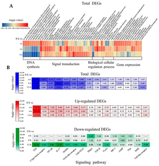 Biological processes and pathways derived from oleodaphnone treatment in NH2 cells. (A) Heatmap revealing critical biological processes in oleodaphnone-treated NH2 cells through GO analysis. A negative logarithm (−log10) conversion was performed on the p-value obtained in the enrichment test, and the larger the converted value was, the more significant the functional type. (B) Heatmap revealing the critical cell signaling pathways in oleodaphnone-treated NH2 cells through KEGG pathway enrichment. A negative logarithm (−log10) conversion was performed on the p-value obtained in the enrichment test, and the larger the converted value was, the more significant the functional type.