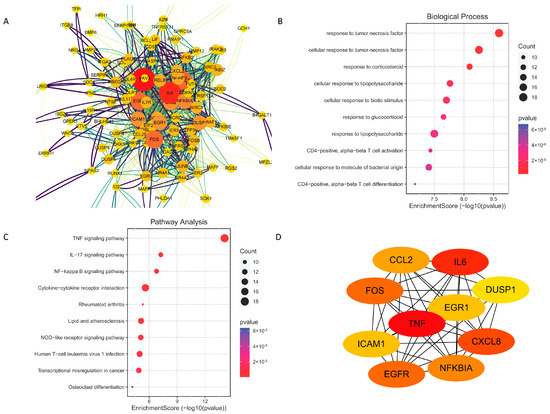 PPI network analysis and identification of Hub Genes. (A) PPI network of 194 DEGs. The larger size and darker color represent more interactions of nodes. (B) Top 10 significantly enriched GO terms in biological processes (BPs). (C) The 20 pathways with the lowest adjusted p values. (D) PPI network of the hub genes.