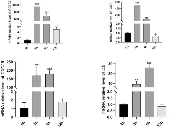 RT-qPCR analysis for CCL2, CCL20, CXCL8 and IL6 genes. (n = 3, * p < 0.05, ** p < 0.01, *** p < 0.001, compared with blank control group).