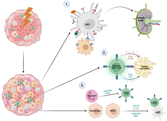 Navigating this literature can be challenging, as the immunological responses are highly dynamic and can vary depending on the TME in question and the IR protocol used [22,23,24,25,26]. Here, we provide an overview on the effects of IR on the immune components of the TME. The influence of IR on immunogenic cell death (ICD) will be discussed, along with the dynamic responses associated with both myeloid and lymphoid immune subsets, providing a greater overall picture of the complex immune stimulative and suppressive processes elicited by IR in tumors. Harnessing the immunological effects of IR is critical to optimizing the efficacy of combination immunotherapies in the future.