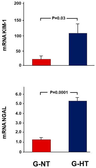 As demonstrated in Figure 2, in the G-HT, there was a 109.9 ± 31.0-fold increase in the expression of KIM-1 in the POK, whereas there was only an 18.3 ± 11.2-fold increase in the G-NT (p = 0.03). A similar trend was observed in the other marker of kidney injury, NGAL (5.4 ± 0.4 vs. 1.2 ± 0.2, p = 0.0001).
