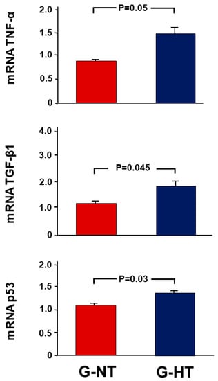 The changes in pro-inflammatory and pro-fibrotic cytokines and the pro-apoptotic p53 gene were similar to renal injury markers (Figure 3). The fold increase in the expression ratio of TNF-α, TGF-β1 and p53 in the POK compared with NOK in the G-HT and G-NT was (1.49 ± 0.23 vs. 0.91 ± 0.04 (p = 0.05), 1.83 ± 0.25 vs. 1.15 ± 0.08 (p = 0.045), and 1.35 ± 0.08 vs. 1.11 ± 0.05 (p = 0.03), respectively).