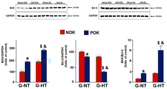 Western blot analysis showing the expression of BAX, Bcl-2, and the BAX/Bcl-2 ratio in the POK (post-obstructed kidney) and the NOK (non-obstructed control kidney) in the two groups. Values represent the mean ± SEM. * indicates statistical significance between the POK and NOK in G-NT; $ indicates statistical significance between the POK and NOK in G-HT; & indicates statistical significance in the % difference between the G-HT and G-NT rats.
